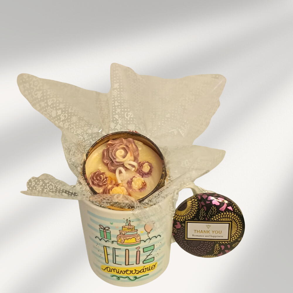 Kit Caneca Feliz Aniversario e Vela Mandala