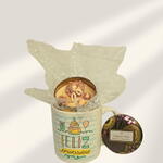 laço dourado - 1 un. caneca feliz aniversário 320ml - 1 un. vela aromatica mandala thank you lata com tampa - 1 un. involucro transparente - 1 un.