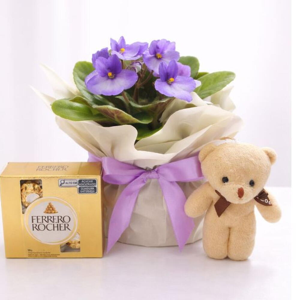 mini ursinho em formato de chaveirinho - 1 un. vaso de violeta plantado embalado em papel e laço de fita - 1 un. uma caixa com 4 bombons ferrero rocher - 1 un.