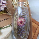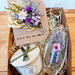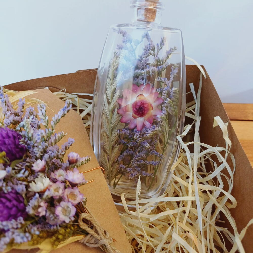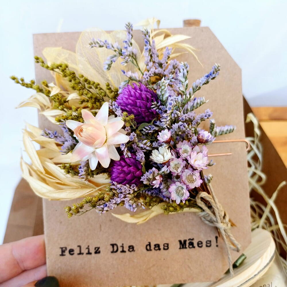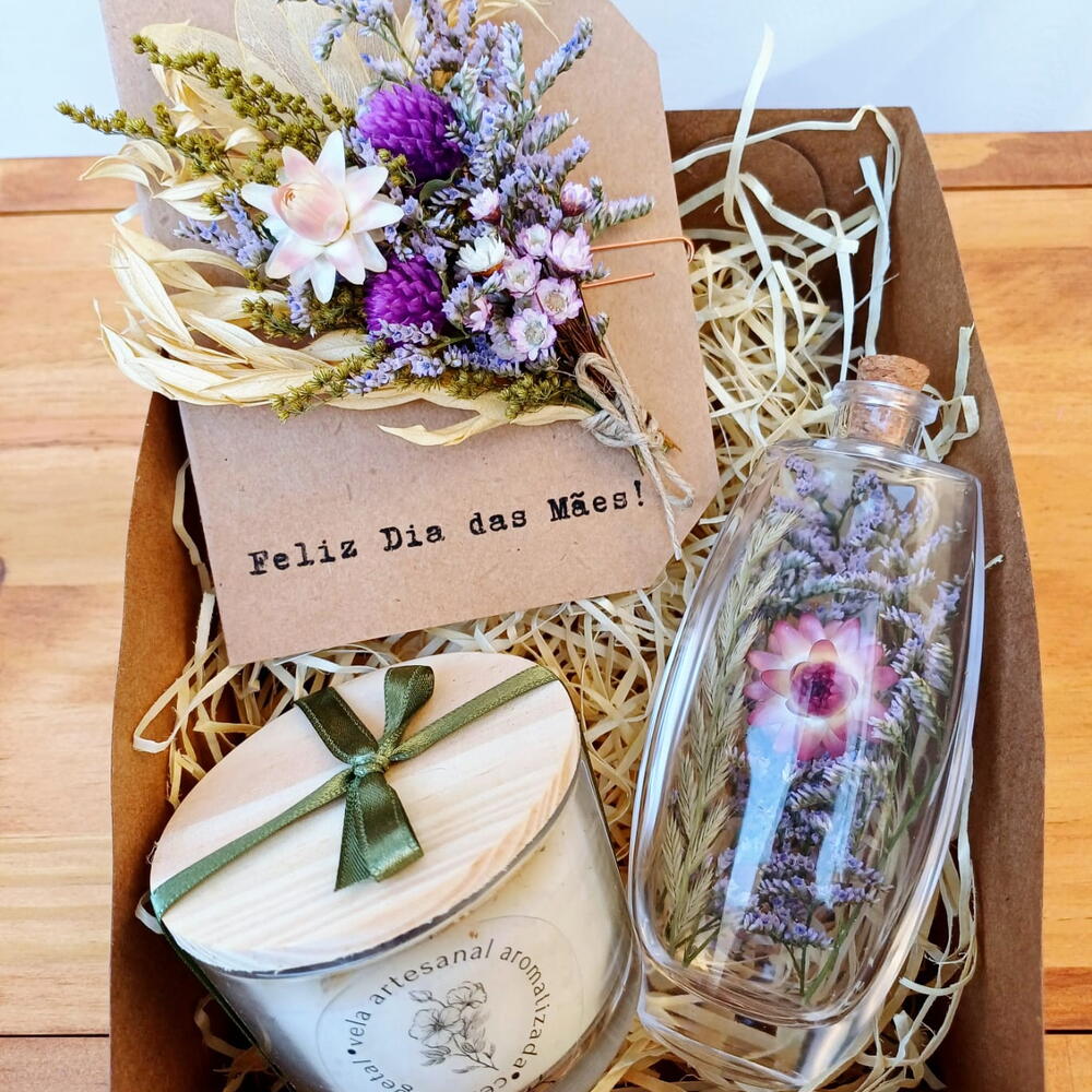 caixa kraft - 1 un. palha decorativa - 1 un. cartão floral buquê - 1 un. vela aromática artesanal cera vegetal aroma canela - 1 un. arranjo floral no vidro com rolha - 1 un.