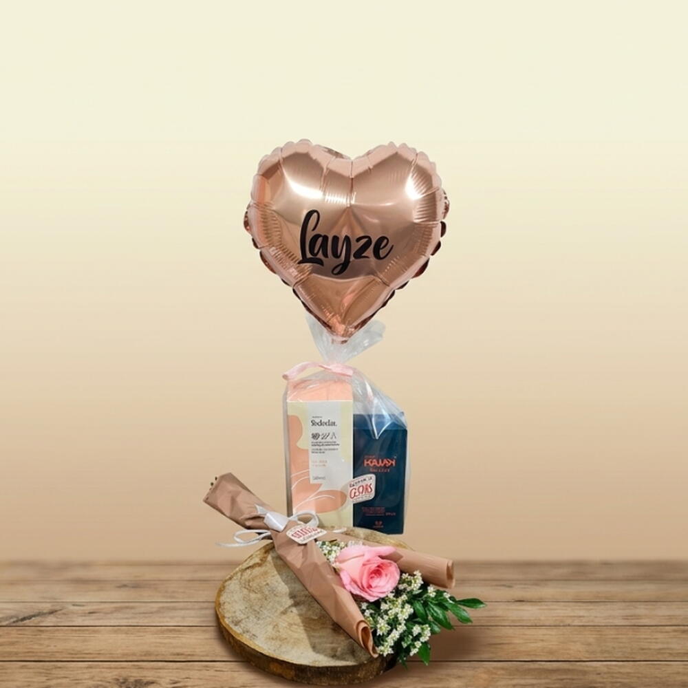 hidratante natura tododia 200 ml - 1 un. desodorante colônia natura 100 ml - 1 un. balão em formato de coração metalizado com personalização (nome gravado) - 1 un. rosa natural fresca - 1 un.