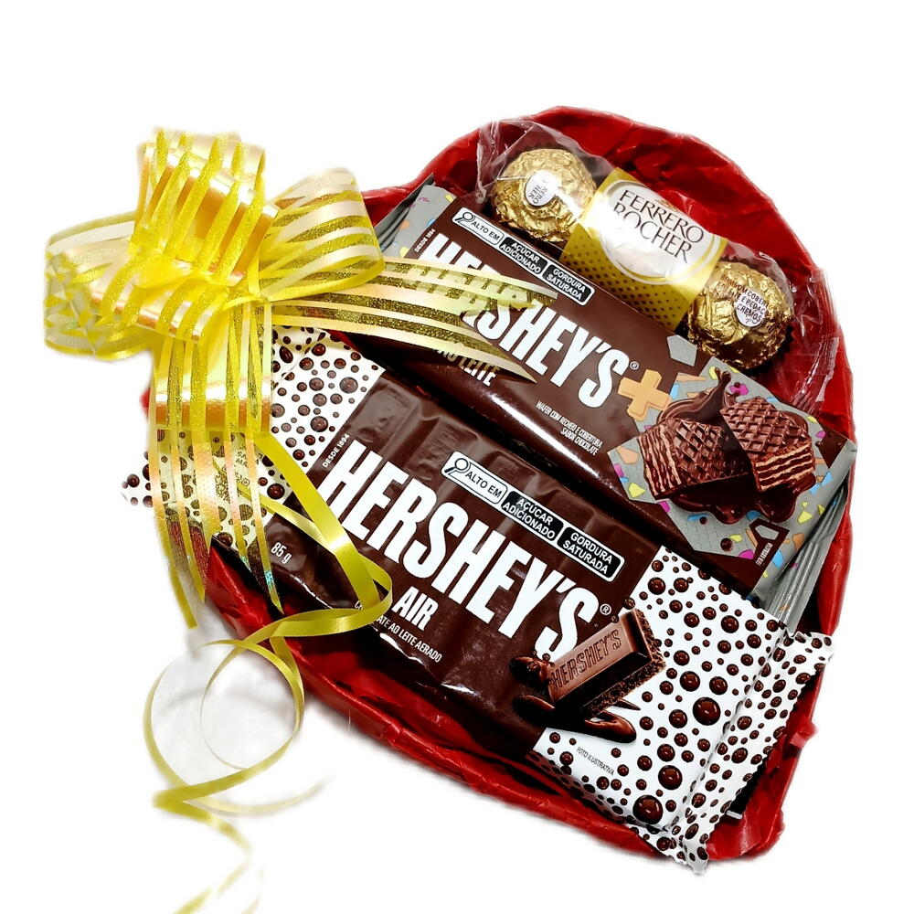Surpreenda com um presente que agrada a todos os gostos com esse kit Suspirante. Contém: *Trio Ferrero Rocher *Barra Hersheys 85g *Wafer Hersheys 102g * Embalado com celofane transparente e laço. Compre já e surpreenda quem faz seu coração bater mais forte!