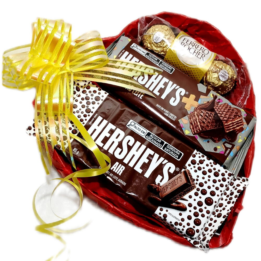 Surpreenda com um presente que agrada a todos os gostos com esse kit Suspirante. Contém: *Trio Ferrero Rocher *Barra Hersheys 85g *Wafer Hersheys 102g * Embalado com celofane transparente e laço. Compre já e surpreenda quem faz seu coração bater mais forte!