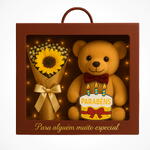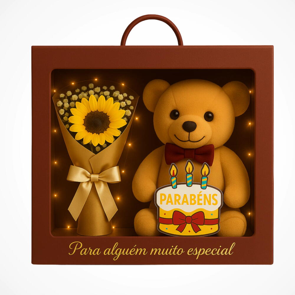 Uma surpresa doce e luminosa para celebrar alguém muito especial. Essa charmosa caixa presente vem com um ursinho fofo segurando um bolo de “Parabéns”, um mini buquê de girassol que transmite alegria e uma delicada iluminação para tornar tudo ainda mais mágico. IMPORTANTE Trabalhamos com flores importadas e selecionadas com todo o cuidado, garantindo qualidade e beleza. Por se tratarem de itens naturais, podem ocorrer variações sutis de cor, tamanho ou forma. AS IMAGENS SÃO MERAMENTE ILUSTRATIVAS!!