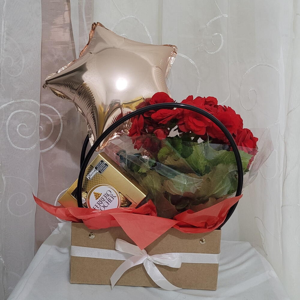 laço tafetá 1.5 mts - 2 un. sacola celofane 55cm - 1 un. caixa acartonada 20x09x12 - 1 un. mini begonia pt 11 cores diversas - 1 un. nalao metalizado modelos diversos 22cm - 1 un. ferrero rocher 8 un unidades - 1 un.