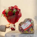 buquê de rosa vermelhas 10/uni - 1 un. coração de madeira com diversos chocolates - 1 un.