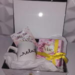 embalagem - 1 un. caneca - 1 un. caixa cartonada - 1 un. laço em cetim - 1 un. mimos - 2 un.