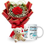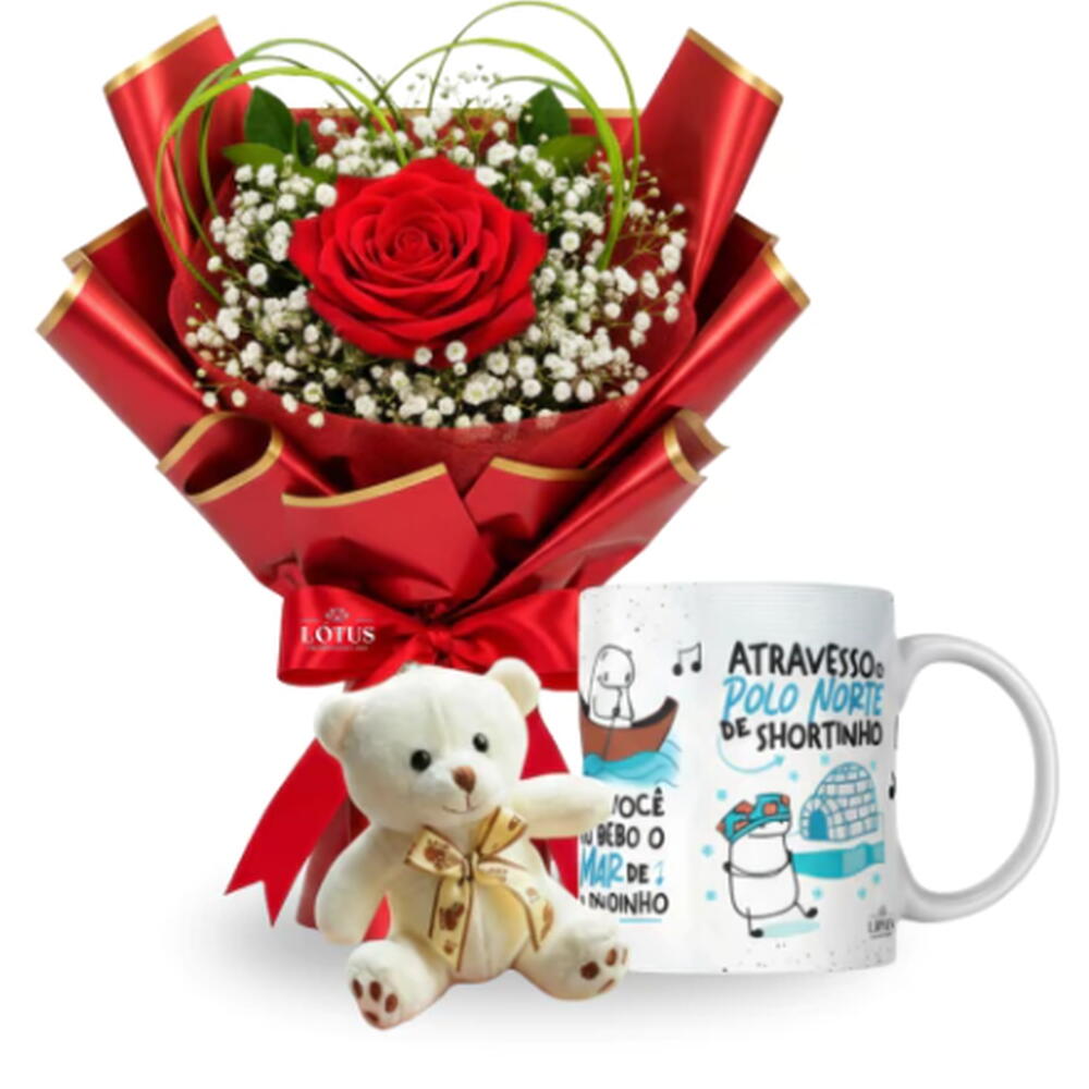 Este kit de presente combina a beleza e simplicidade das rosas com a doçura de um ursinho de pelúcia. Acompanha uma bela caneca e vem delicadamente embalado, com um laço de fita para completar o charme do conjunto. Ideal para demonstrar carinho e atenção a alguém especial.