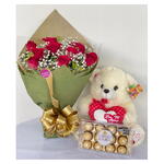 Este presente é a expressão perfeita do amor e doçura. Composto por uma elegante embalagem contendo 1 unidade de Ferrero Rocher, 10 unidades de rosas vermelhas vibrantes que simbolizam paixão intensa, 1 adorável pelúcia de tamanho médio para transmitir afeto, e complementos de folhagens para dar um toque natural. É o mimo ideal para surpreender e encantar seus entes queridos em qualquer ocasião.