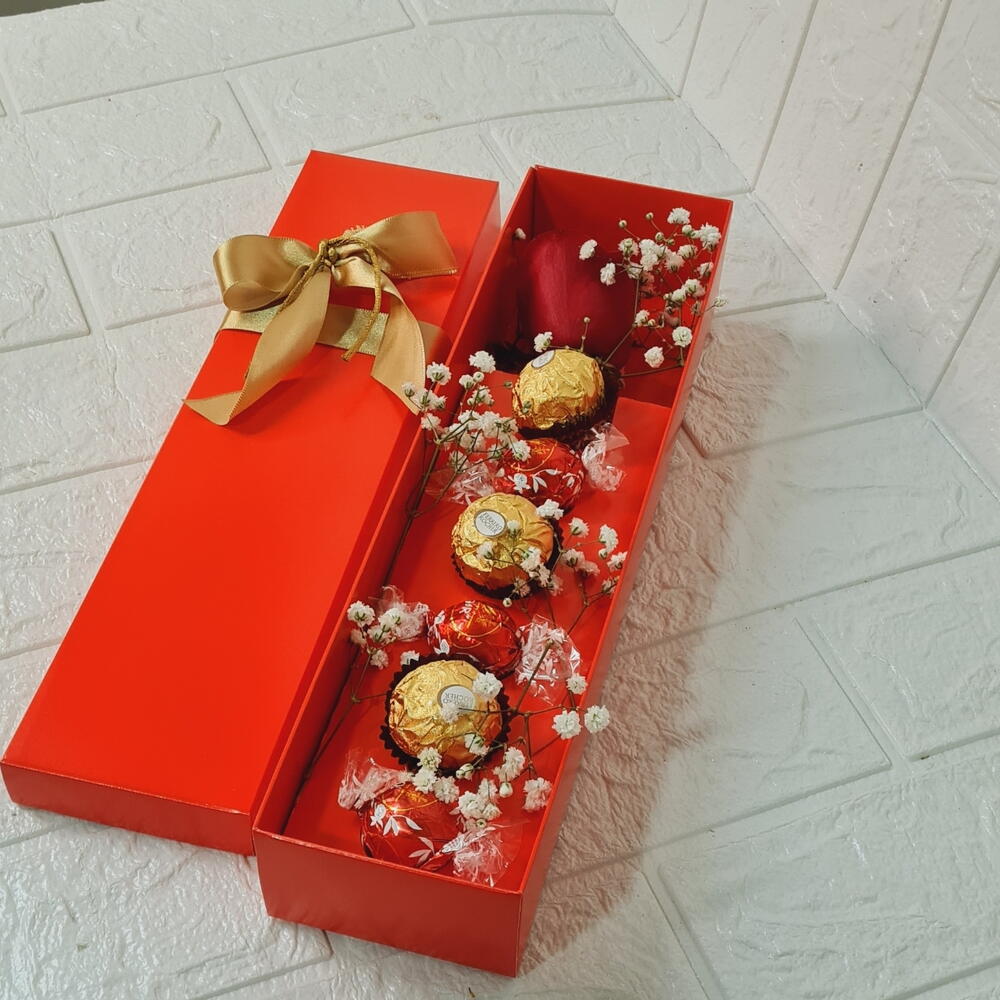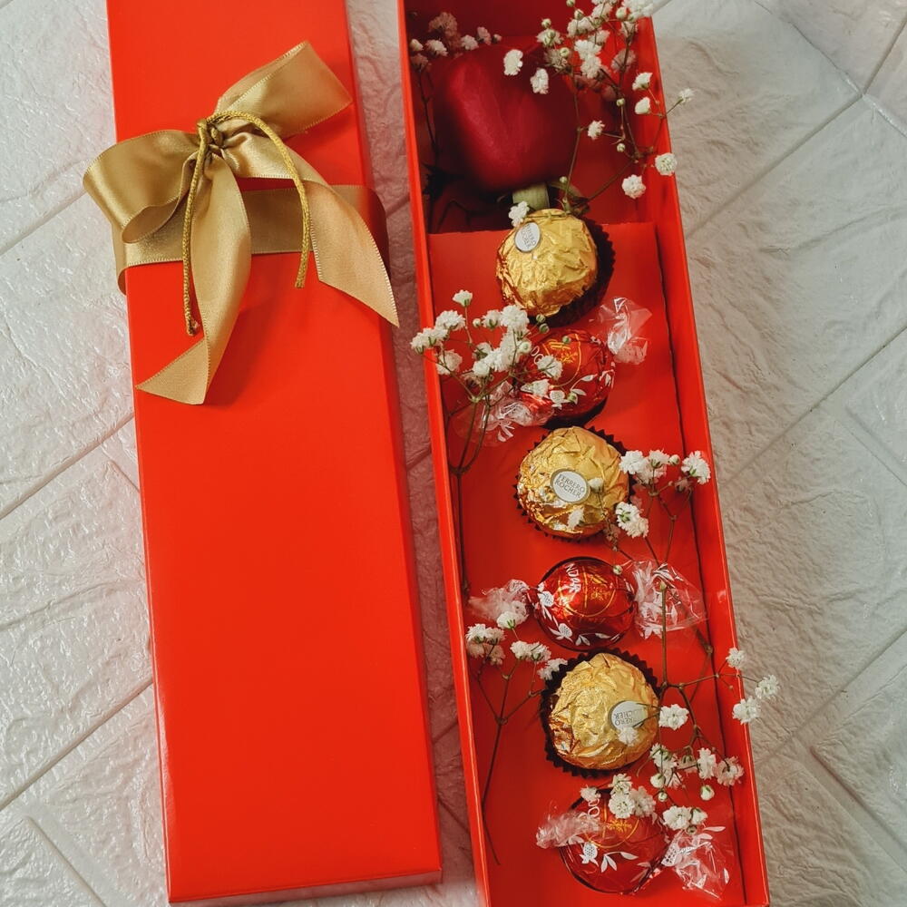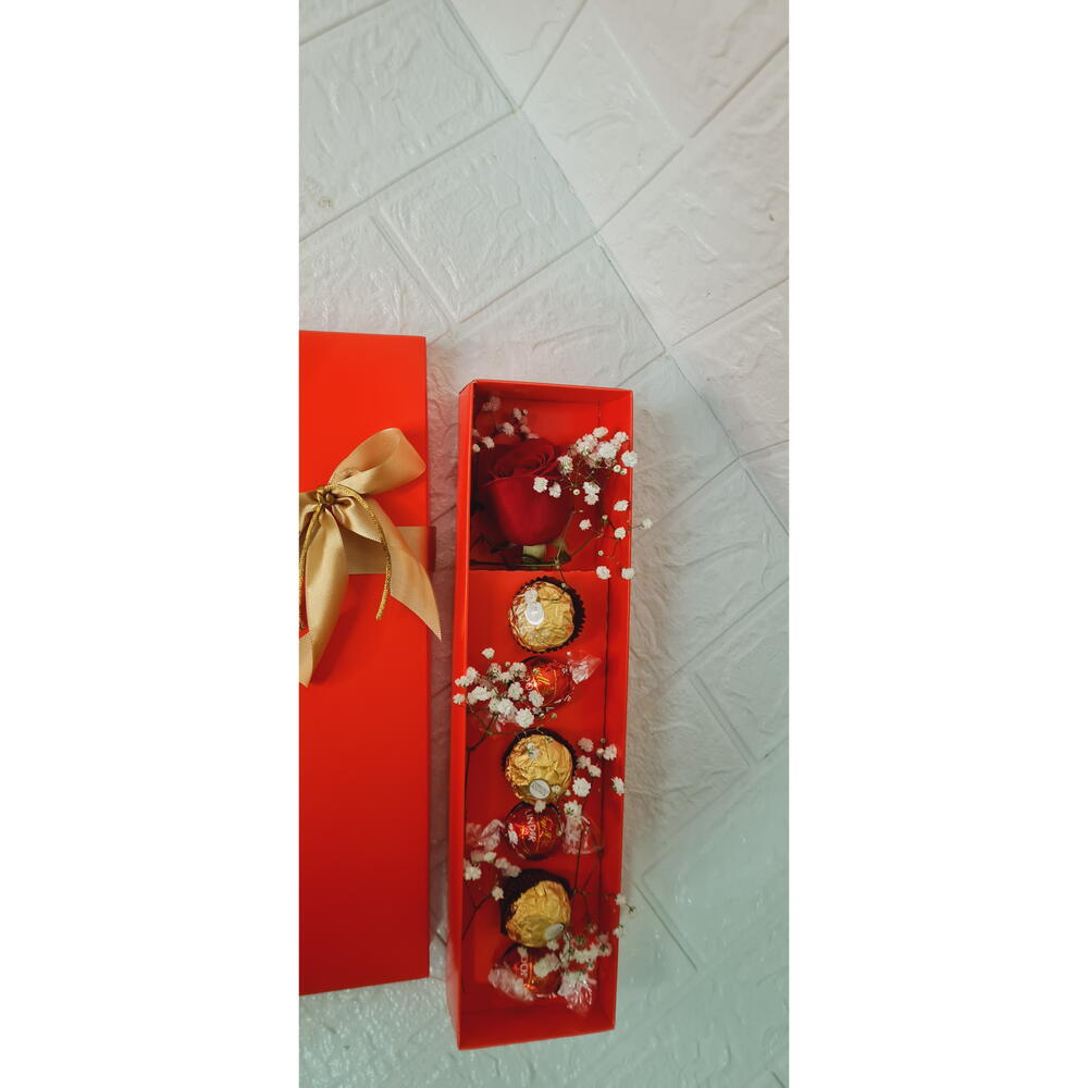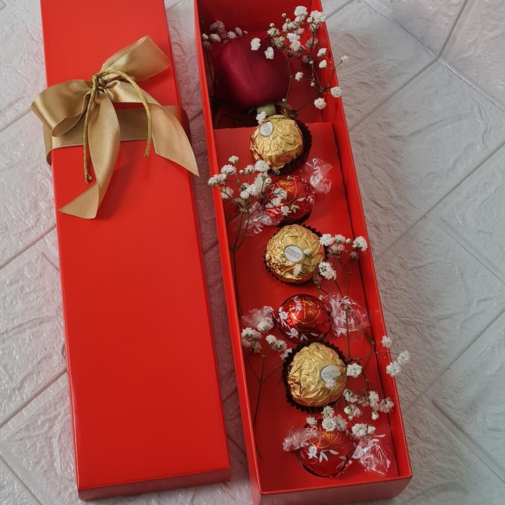 Este kit de presente elegante é a expressão perfeita do amor e carinho. Composto por uma rosa deslumbrante, simbolizando a beleza e paixão, três doces bombons Lindt, oferecendo um prazer suave e cremoso, e três chocolates irresistíveis da Ferrero, proporcionando um deleite decadente. Tudo isso é cuidadosamente embalado em uma caixa personalizada, tornando-a uma bela surpresa. Além disso, o kit inclui ainda folhagens decorativas, adicionando um toque de natureza e frescor. Este kit de presente é a maneira perfeita de mostrar o quão especiais são as pessoas em sua vida.