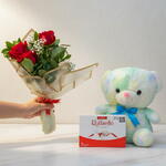 chocolate raffaello - 1 un. urso de pelúcia 40cm - 1 un. buquê de rosa vermelhas 3/uni - 1 un.