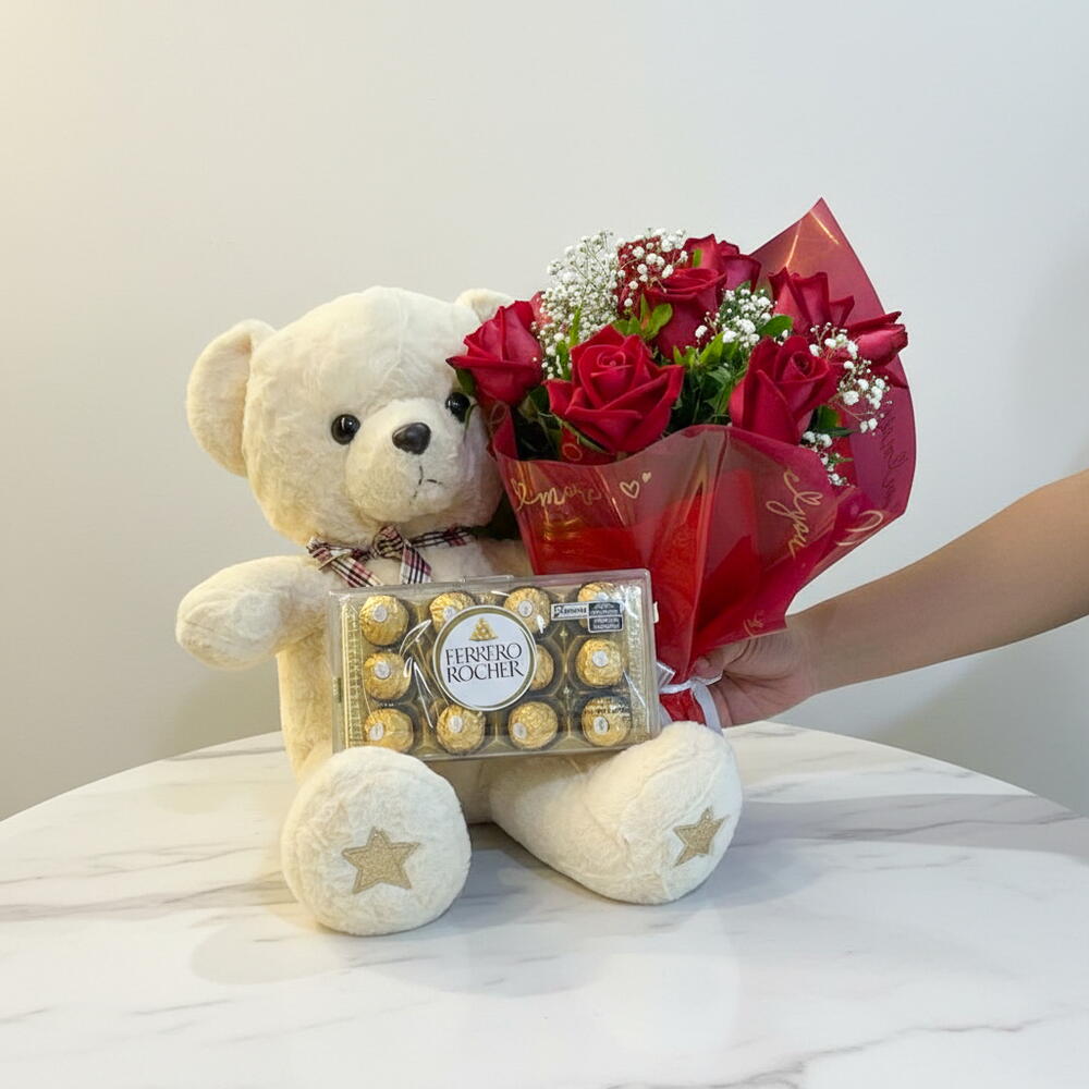 Este encantador kit de presente é composto por um adorável urso de pelúcia de 60 cm perfeito para abraçar, um buquê de rosas vermelhas românticas com dez unidades para expressar seu amor e uma irresistível caixa de chocolates Ferrero Rocher de 150 gramas para satisfazer o paladar. Ideal para qualquer ocasião especial.