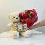 urso de pelúcia 60 cm - 1 un. buquê de rosa vermelhas 10/uni - 1 un. ferrero rocher 12/uni - 150 gr.