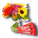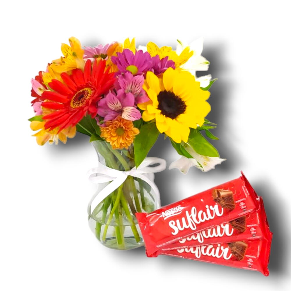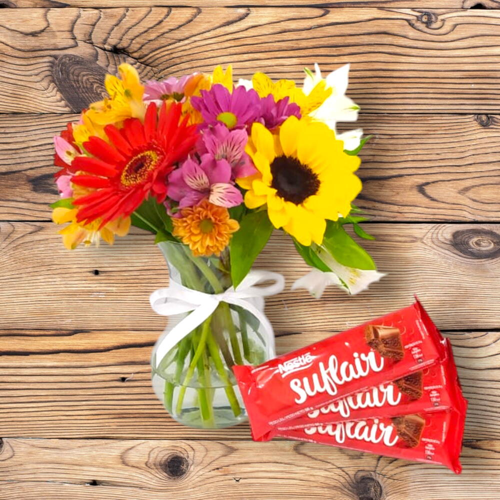 vaso de vidro - 1 un. laço - 1 un. embalagem celofane - 1 un. barras de chocolate suflair - 3 un. laço em cetim - 1 un. lindo arranjo de flores silvestres - 1 un.
