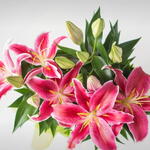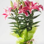 Este magnífico arranjo de lírios cor de rosa é um deleite para os olhos! Apresentado em um vaso plástico sofisticado, os lírios são protegidos por uma embalagem de celofane brilhante para manter a beleza e frescor das flores. Além disso, é decorado com um charmoso laço para adicionar um toque especial. Perfeito para dar um toque de cor e elegância em qualquer ambiente!