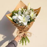 Este deslumbrante buquê é composto por seis lírios deslumbrantes, disponíveis em várias cores de sua escolha, destacadas por uma única unidade de folhagem. Envoltas em uma embalagem de design exclusivo e finalizadas com um toque rústico através de um laço delicado, essas flores são garantia de adicionar uma pitada de elegância a qualquer ambiente. Ideal para presentear alguém especial ou embelezar seu espaço próprio.