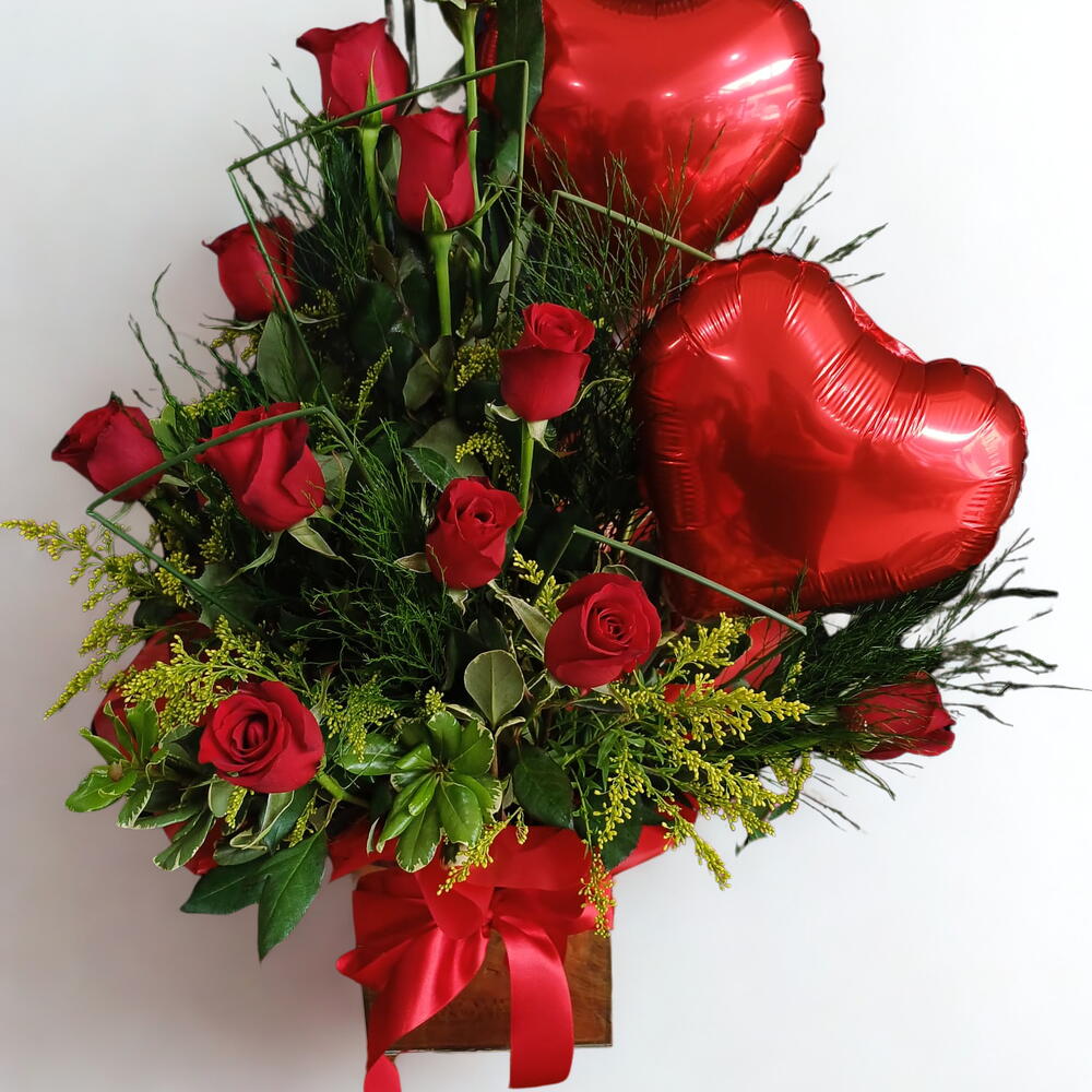 rosa vermelhas - 12 un. balões de coração - 2 un.