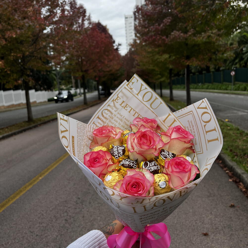 Este buquê é composto por um belo arranjo de 7 rosas frescas e 6 deliciosos chocolates Ferrero Rocher e Ouro Branco. Delicadamente embalado em papel jornal e finalizado com um elegante laço de cetim, este buquê é perfeito para expressar seu carinho e apreço por alguém especial. Encante e surpreenda com este presente elegante e saboroso!