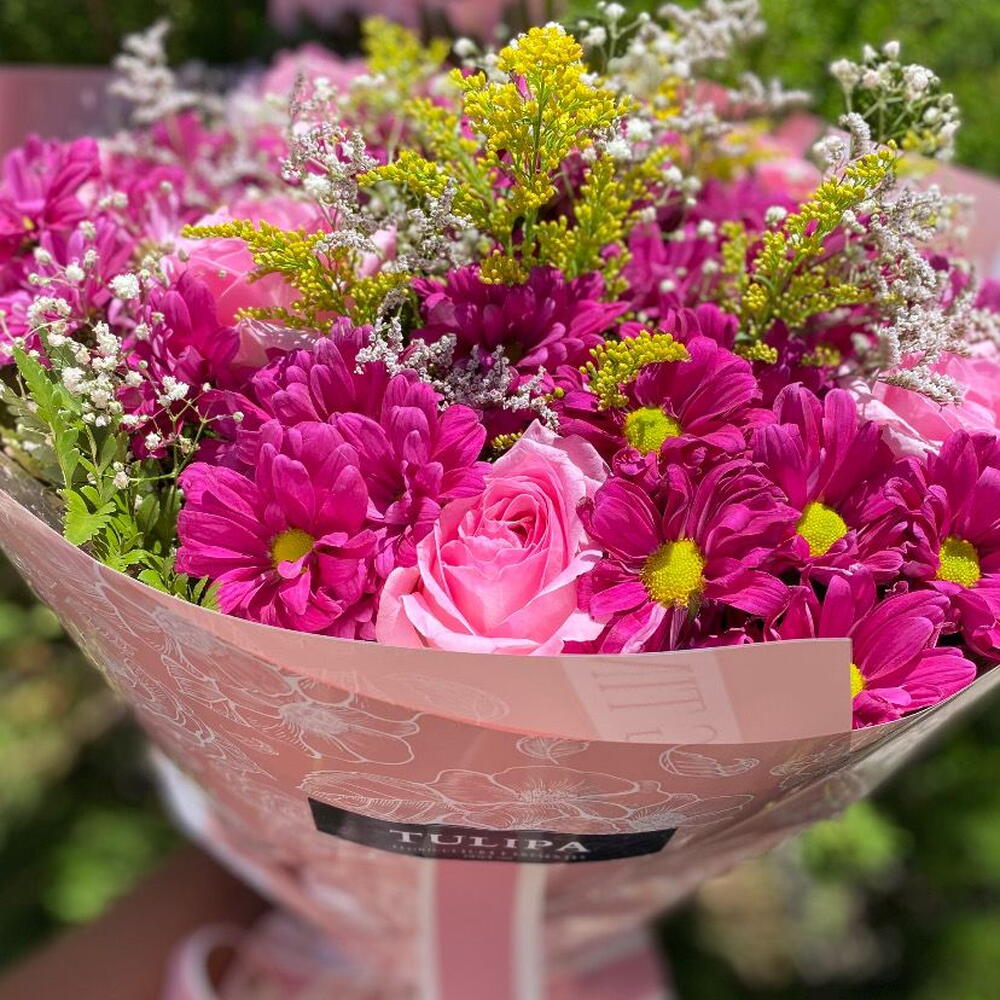 rosa - 5 un. embalagem - 1 un. folhagens - 1 un. laço - 1 un. mix de margaridas - 1 un.