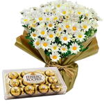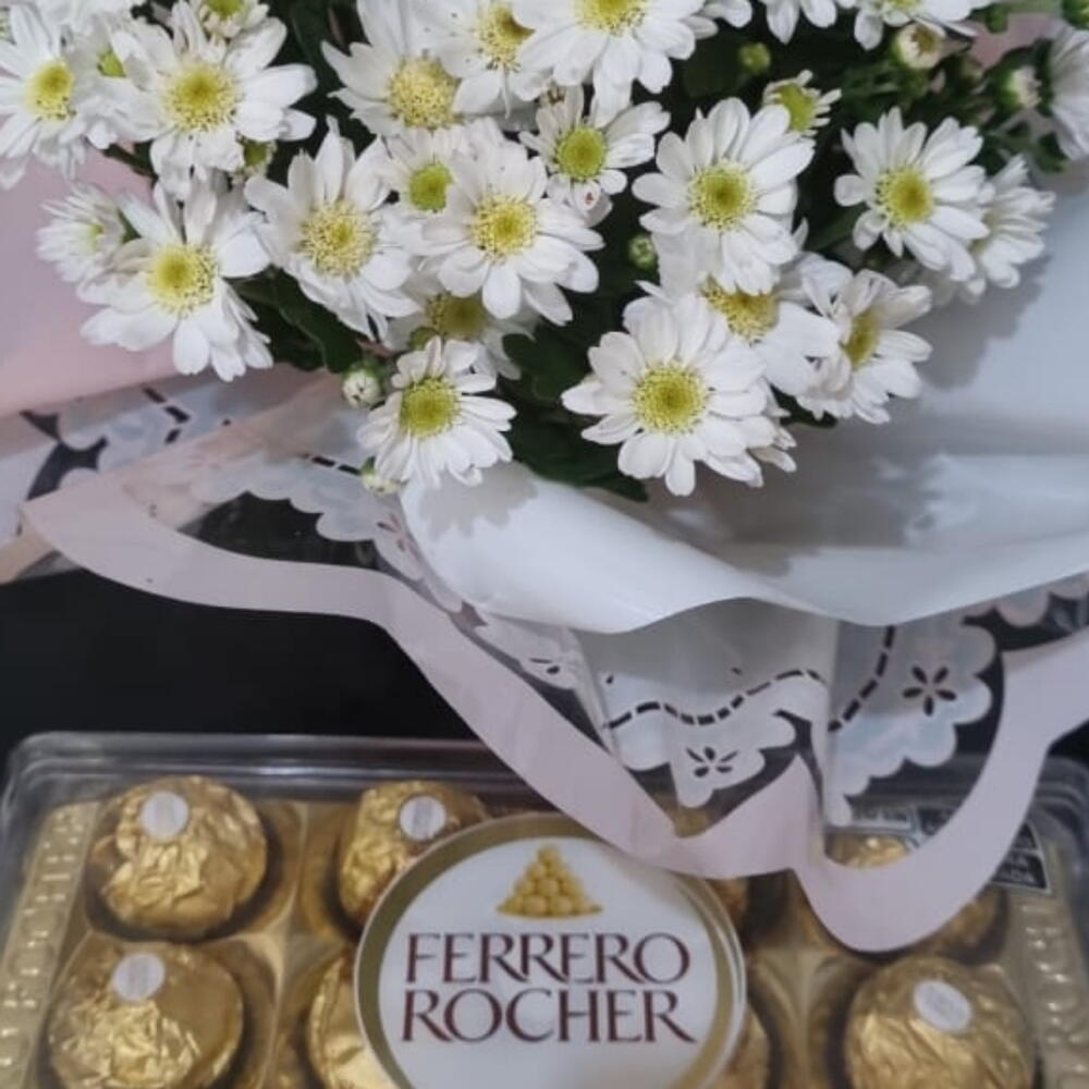 fita - 1 un. embalagem - 1 un. ferrero rocher - 1 un. cartão mensagem - 1 un. margaridas - 1 un. obs:. embalagem poderá variar entre as cores : branco - 1 un. dourado - 1 un. vermelho ou rosa. - 1 un.