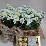 Uma caixa com 2 margaridinhas cor conforme disponibilidade do dia. Com 8 bombons ferreiro rocher.