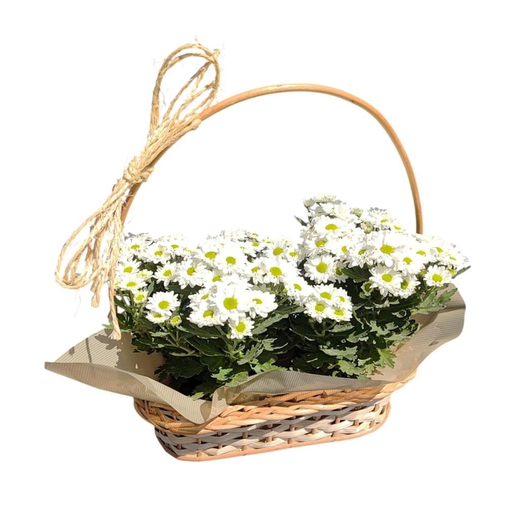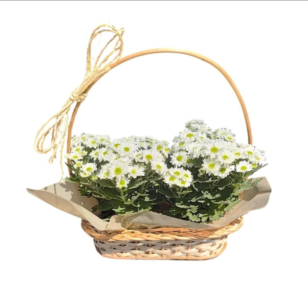 laço ráfia - 1 un. celofane embalagem - 1 un. cesta de vime artesanal - 1 un. margaridinhas brancas plantadas - 2 un.