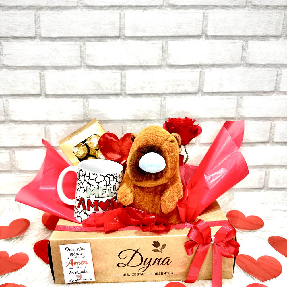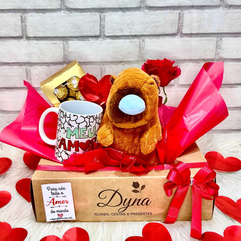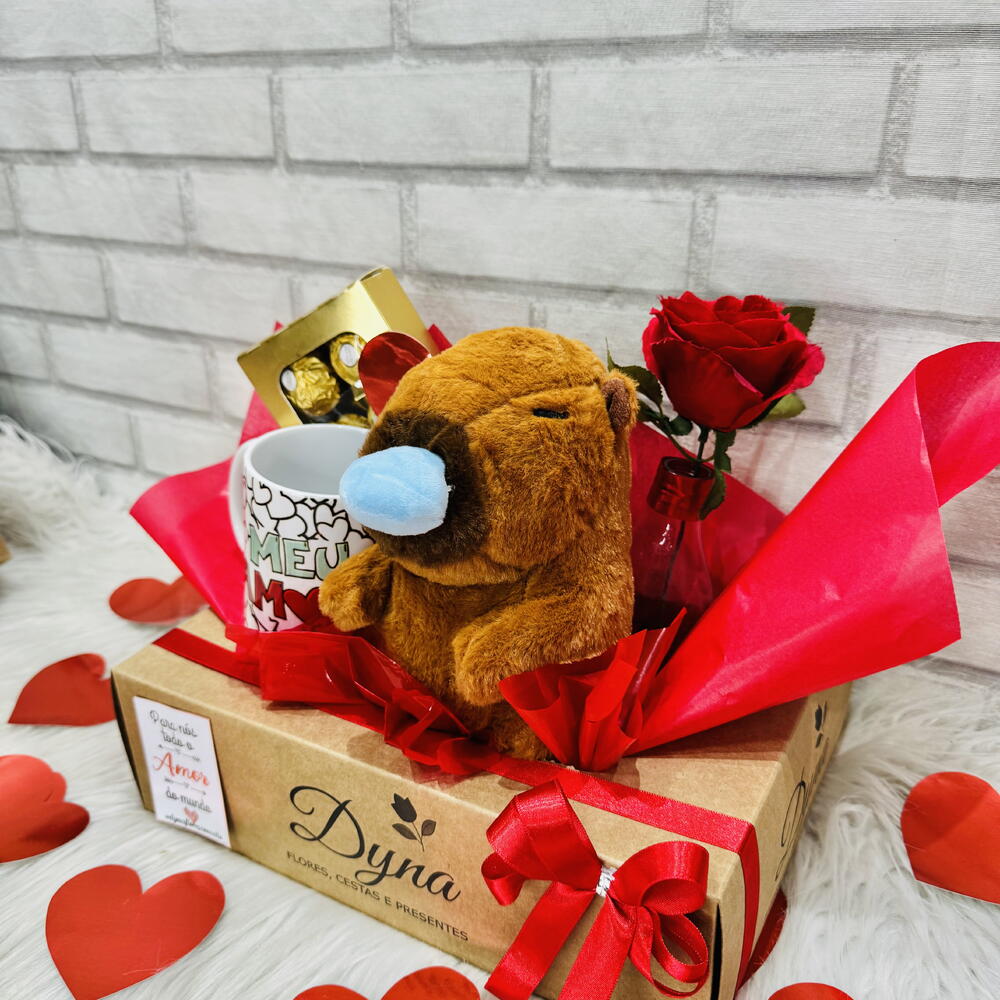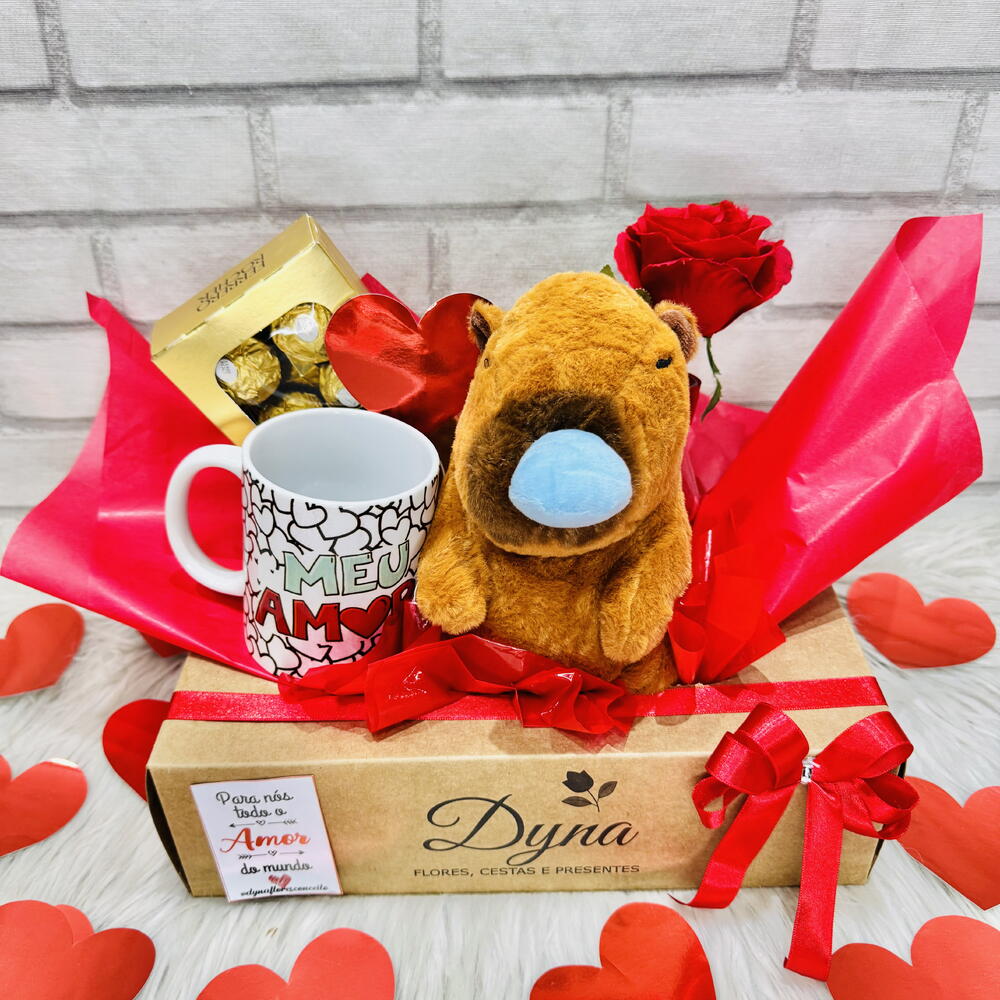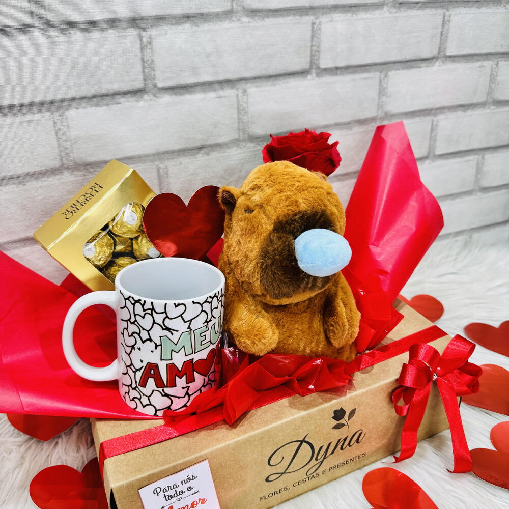 ferrero rocher t8 - 1 un. tag e cartão - 1 un. cesta decorada e fechada no celofane com laço - 1 un. capivara pelúcia - 1 un. caneca porcelana personalizada - 1 un. vaso com rosa natural - 1 un.