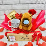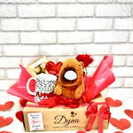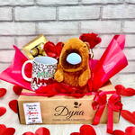 Esta cesta peculiar contém uma mistura maravilhosa de presentes pensados com cuidado para tornar o dia de alguém especial. Contendo um cobiçado ferrero rocher t8, um marcador e cartão personalizado para expressar seus sentimentos da maneira mais sincera possível. A cesta, além de estar lindamente decorada, é fechada em celofane, arrematada com um laço, adicionando um toque de elegância extra ao presente. Existem também algumas surpresas adicionais na cesta, incluindo uma adorável capivara de pelúcia, uma caneca de porcelana personalizada perfeita para aconchegantes manhãs com café, e um vaso com uma rosa natural, adicionando um toque de frescura e beleza natural à cesta. Este é o presente perfeito para demonstrar carinho e apreciação, seja qual for a ocasião.