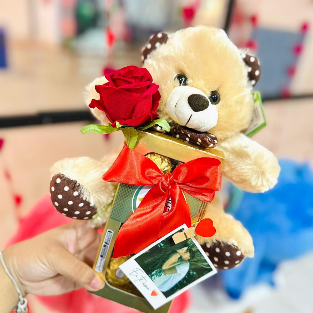 rosa artificial - 1 un. ursinho 25 centímetros - 1 un. caixa de ferrero com 8 - 1 un. polaroid personalizado - 1 un.