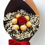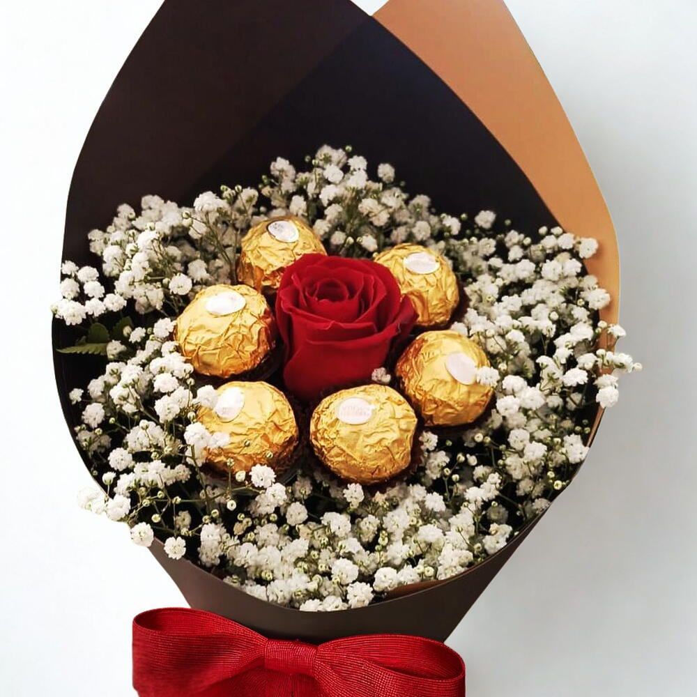 rosa - 1 un. laço - 1 un. bombom ferrero rocher - 6 un. mosquitinhos - 1 un. embalagem karft - 1 un.