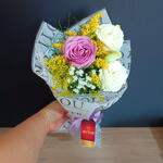lisianthus branco - 1 un. rosa lilás - 1 un. gypisophila - 1 un. folhagens verdes e tango amarelo - 2 un. embalagem poli acetinado love - 1 un. laço de cetim lilás - 1 un.