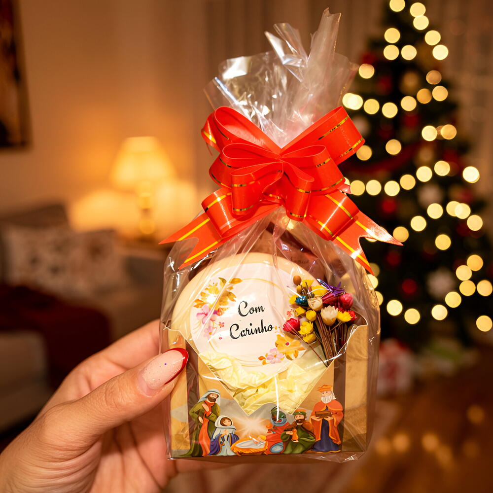 ✨ **Mimos de Natal** ✨ Surpreenda quem você ama com nossos encantadores presentes de Natal! Cada mimo é cuidadosamente embalado em celofane, adorned with a festive red bow, trazendo um toque especial de carinho. • **Chocolates Deliciosos**: Delicie-se com chocolates finos, embrulhados em papel rosa e dourado, perfeitos para adoçar o seu Natal. • **Biscoitos Decorados**: Nossos biscoitos, com a frase Com Carinho, são uma verdadeira obra de arte que trazem sabor e afeto. • **Ambiente Aconchegante**: Cada presente é acompanhado por uma atmosfera mágica, com lareiras acesas e árvores iluminadas, criando memórias inesquecíveis. 🎁 **Faça deste Natal um momento especial e cheio de amor!** Adquira já o seu e espalhe a magia do Natal! 🎄❤️