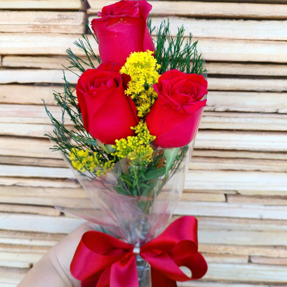 rosa vermelha - 3 un. embalagem transparente - 1 un. laço delicado - 1 un. folhagens verdes e tango amarelo - 2 un.