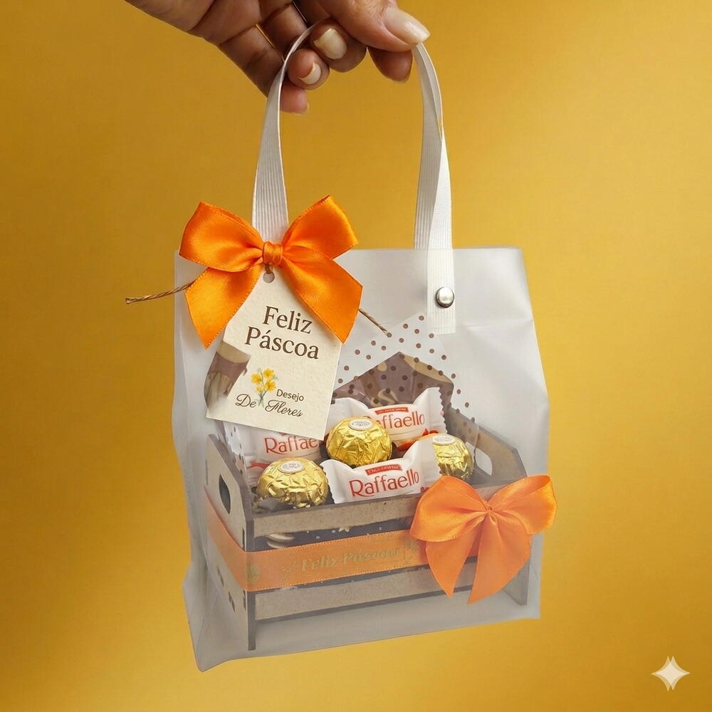 Um Mimo Especial para uma Páscoa Inesquecível 🐰🍫 Procurando um presente que fuja do óbvio? Conheça nossa Bolsa Duo Premium. O que vem: Uma seleção irresistível de bombons Ferrero Rocher e Raffaello. Diferencial: Apresentação impecável em caixote de MDF decorado, envolto em uma embalagem moderna com alças, pronta para entregar. Toque final: Tag de Feliz Páscoa e laços artesanais.