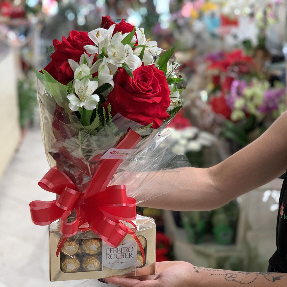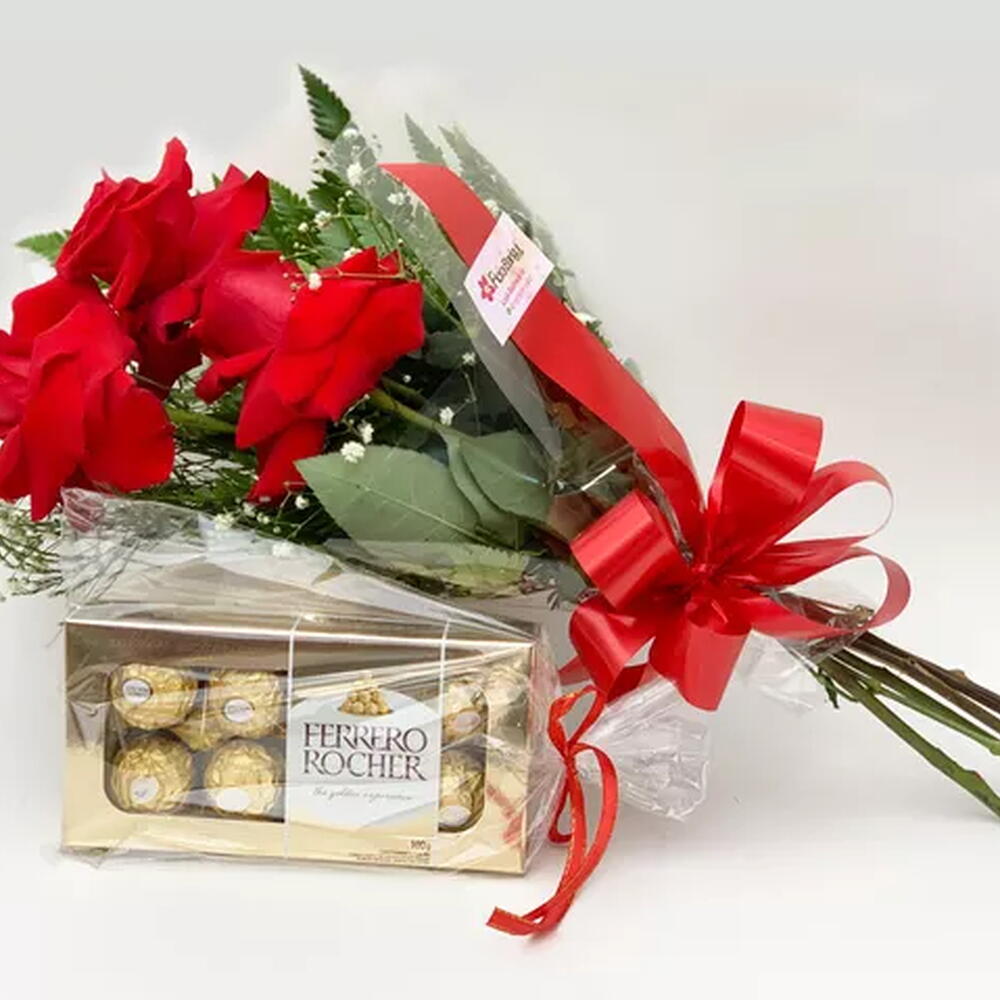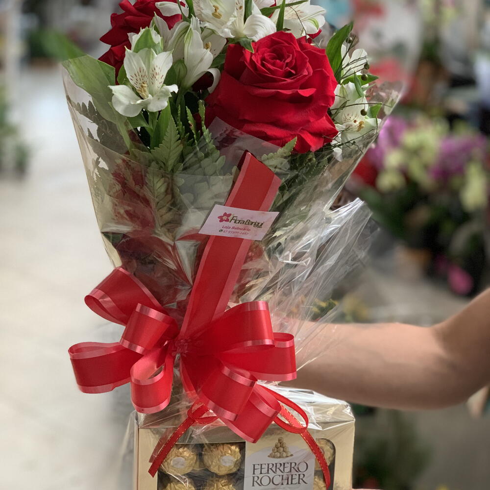 Imagine a alegria ao receber um lindo buquê de rosas frescas acompanhado de um delicioso Ferrero Rocher.