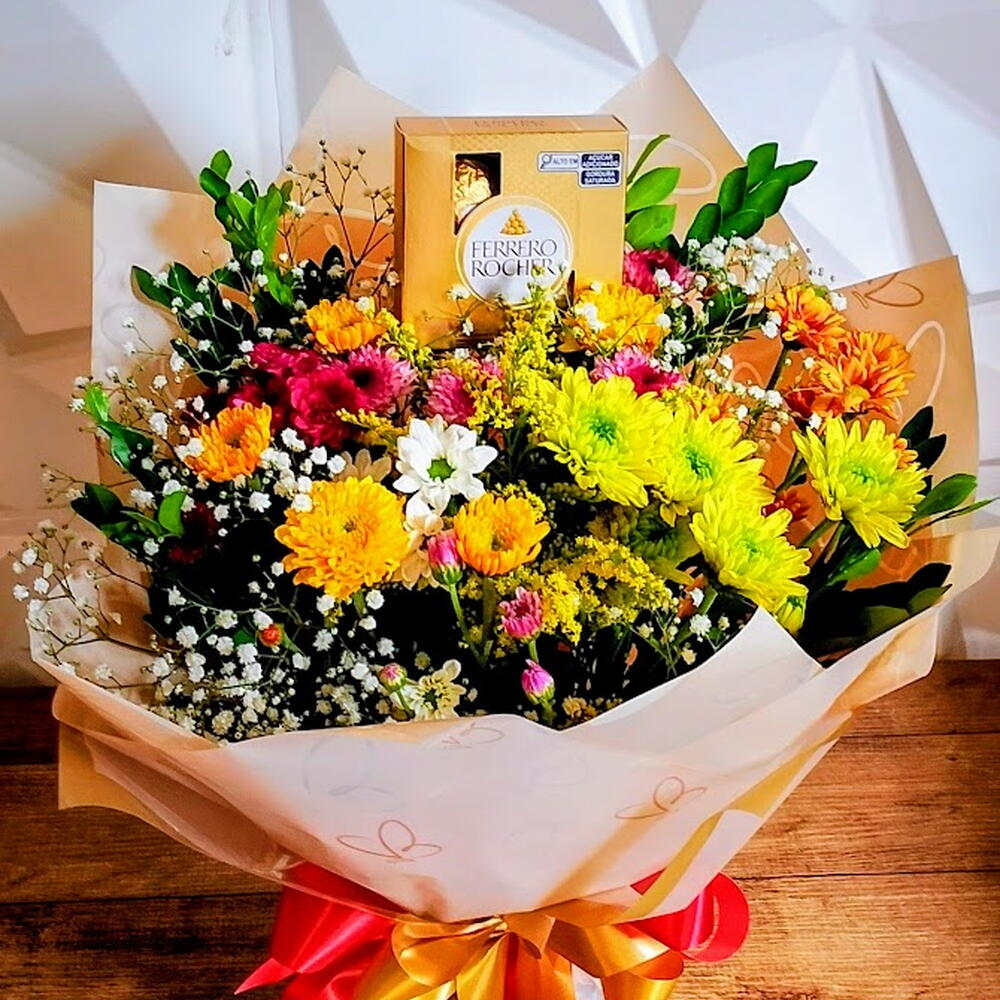Presenteie com um mine buquê de flores do campo para alegrar e trazer felicidade para o dia de alguém, e uma caixa com 4 bombons Ferrero Rocher trazendo sabor.