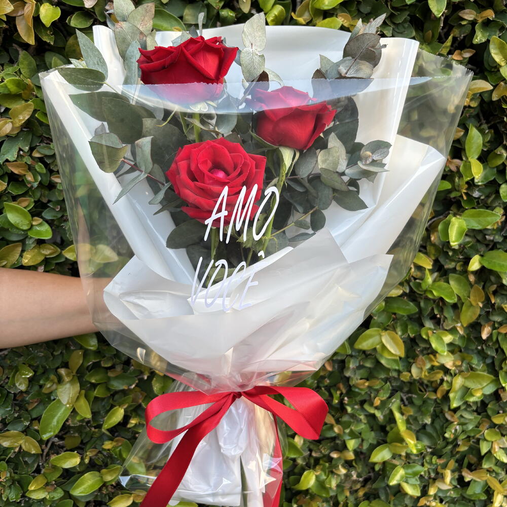 Este encantador buquê é composto por três magníficas rosas colombianas que simbolizam encanto e elegância. Complementado com três folhagens de eucalipto cuidadosamente escolhidas que adicionam uma textura única e aromática ao conjunto. Lindamente apresentado numa elegante embalagem para presente, acompanhada por um laço de cetim de 35 cm, que adiciona um toque final de sofisticação. Seria o presente perfeito para demonstrar seu carinho e apreço em qualquer ocasião.