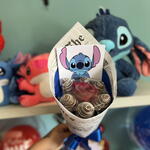 Este buquê é uma combinação encantadora e única de beleza e doçura. Composto por uma rosa elegante, seis sumptuosos morangos e um adorável desenho do Stitch, tudo sofisticadamente envolvido em uma embalagem de papel jornal e finalizado com um delicado laço de cetim. Uma escolha perfeita para expressar sentimentos de amor e apreço por seus entes queridos.