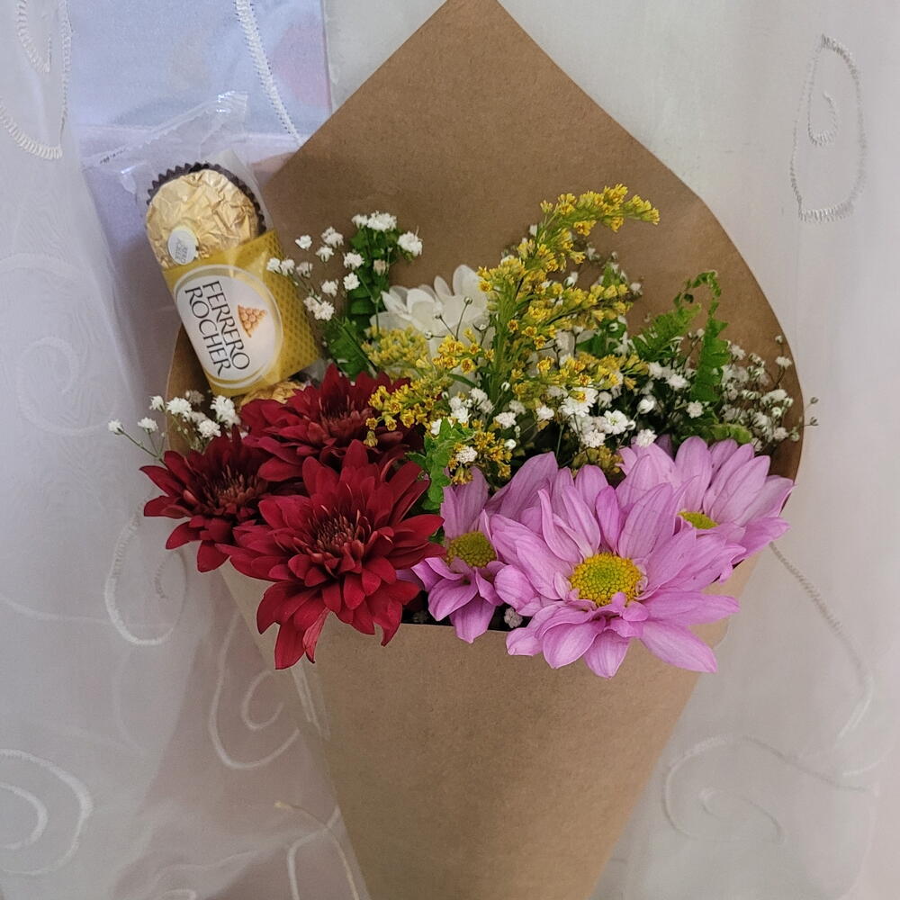 Encante-se com a simplicidade do nosso buquê, adornado com a pureza de três margaridas, aclamadas pelo seu charme natural. Este conjunto é enriquecido pela presença de um trio de Ferrero Rocher, simbolizando o mais doce amor. Uma pitada de Gipsonphila adiciona um toque final etéreo a esta composição, tornando-a uma oferta perfeita para demonstrar seu carinho de maneira elegante e doce.
