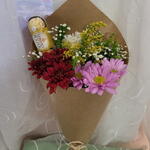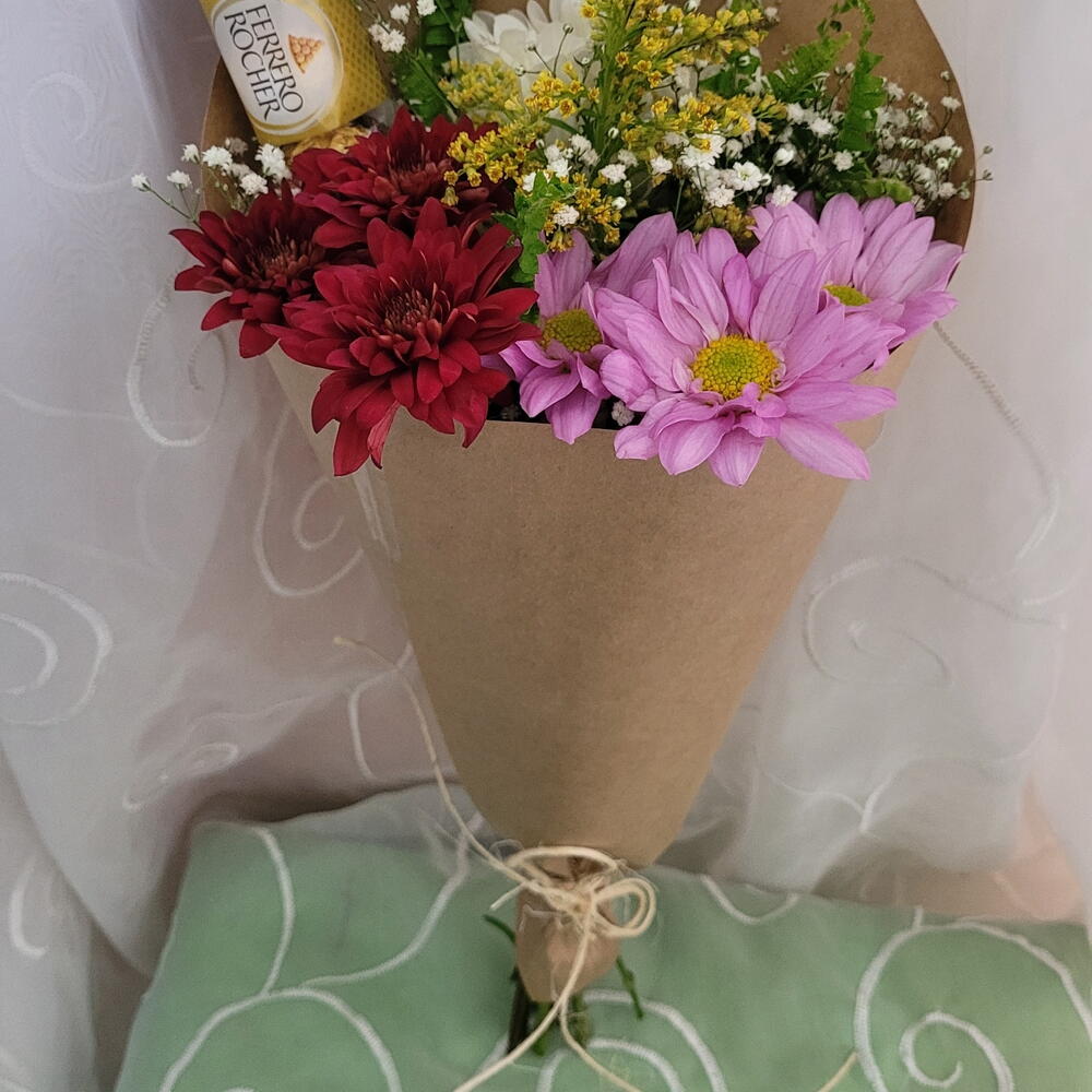folhagens - 1 un. laço - 1 un. margaridas - 3 un. ferrero rocher trio - 1 un. gipsonphila - 1 un. embalagem karft - 1 un.