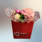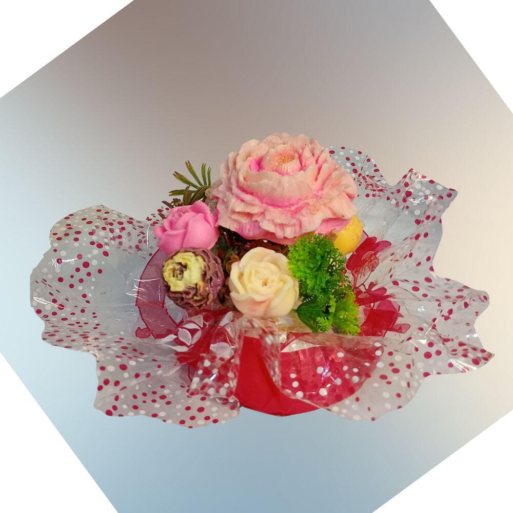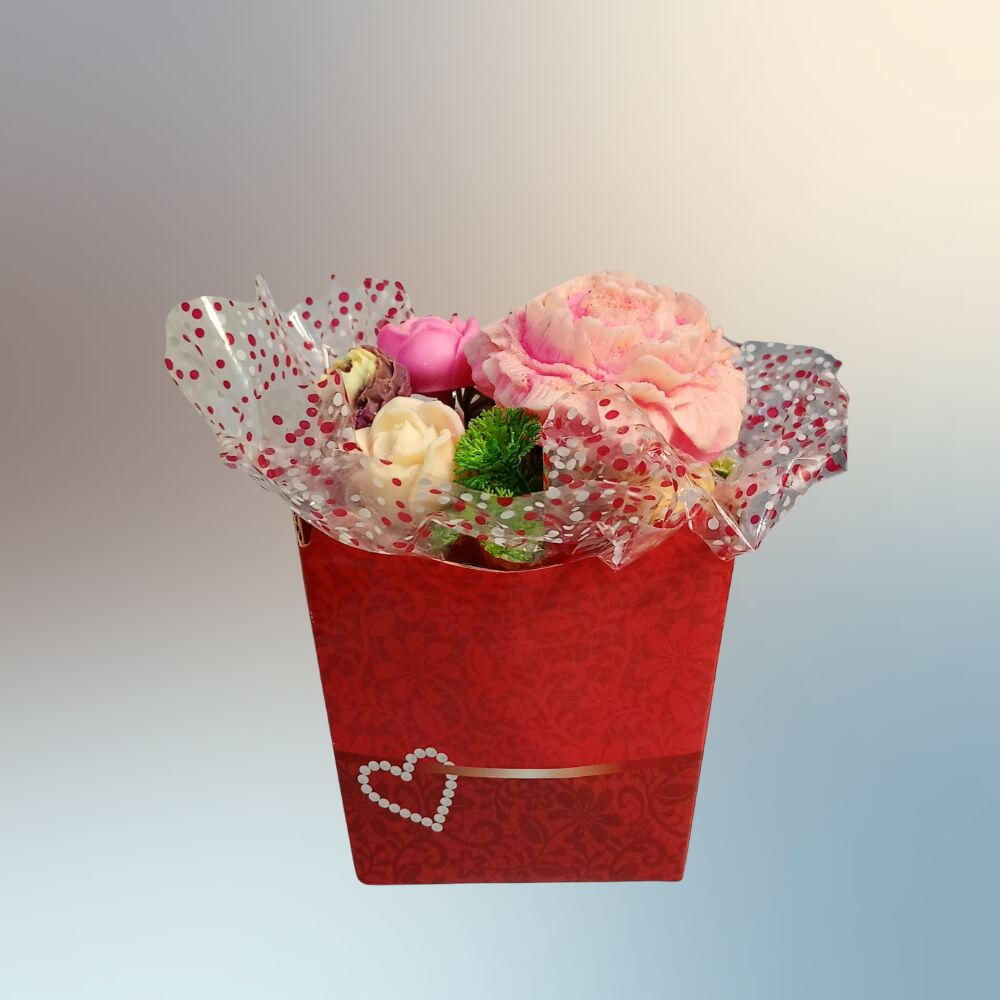 wax melts cera aromática peônia - 1 un. wax melts cera aromática mini rosinhas - 4 un. guarnição arranjo artificiais - 1 un. cachepot vermelho com mini coração perola e laço dourado impresso - 1 un. 1 involucro transparente com alça e fundo vermelho - 1 un.