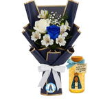 Mini buquê de rosa azul e branca com astromelias brancas + Potinho iluminado