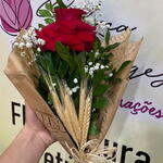 Este buquê é composto por uma rosa vermelha elegantemente selecionada, complementada por folhagens frescas para um visual verde-rico. O conjunto é cuidadosamente embalado e amarrado com um laço, criando um presente perfeito e emocionante para demonstrar seu amor e cuidado.