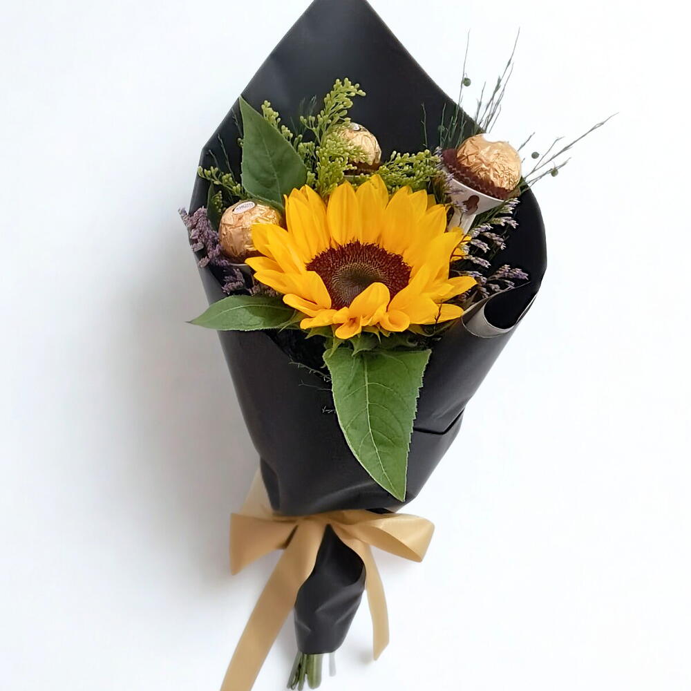 Este produto é a combinação perfeita de elegância e doçura. Consiste em um girassol encantador (1 unidade) emparelhado com um irresistível blister Ferrero que contém 3 unidades de chocolates ricos e cremosos. É o presente perfeito para expressar sentimentos de amor, gratidão e felicidade.