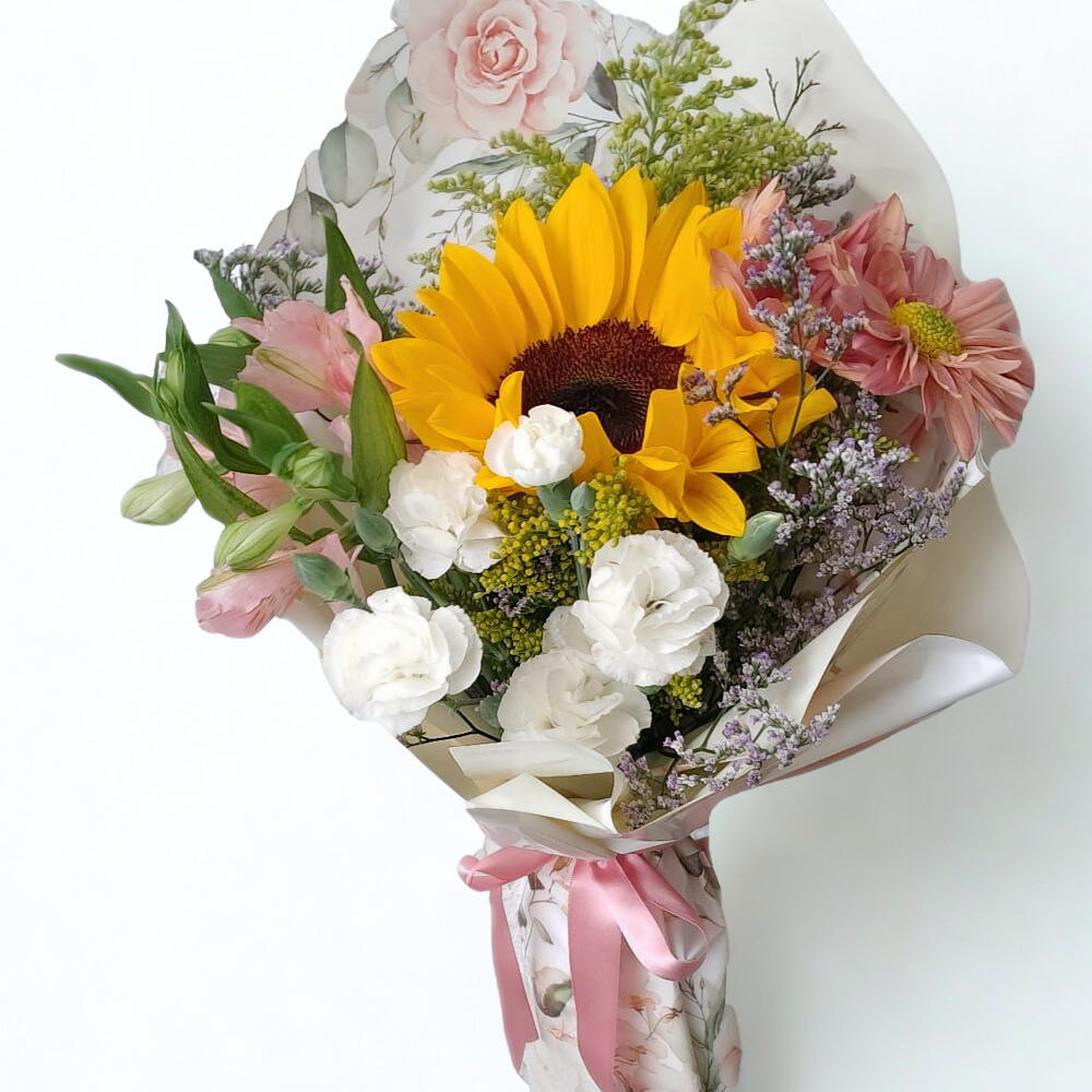 Um mini buquê misto com girassol, trazendo um toque de alegria e cor para qualquer ocasião. Um arranjo compacto e encantador, perfeito para transmitir luz e frescor de forma delicada.