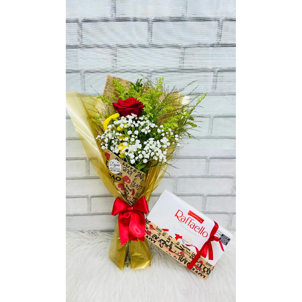 Este maravilhoso presente com chocolate é perfeito para mostrar quanto você se importa. Composto por um buquê com uma rosa vermelha encantadora, acompanhada por belas folhagens e complementos, ele é mais do que apenas um presente, é um ato de amor. Delicadamente embalado, com laço elegante, este presente impressionante é ainda mais doce com a inclusão de uma caixa de Raffaello. Sentimentos e sabores em perfeita harmonia para encantar os amados.