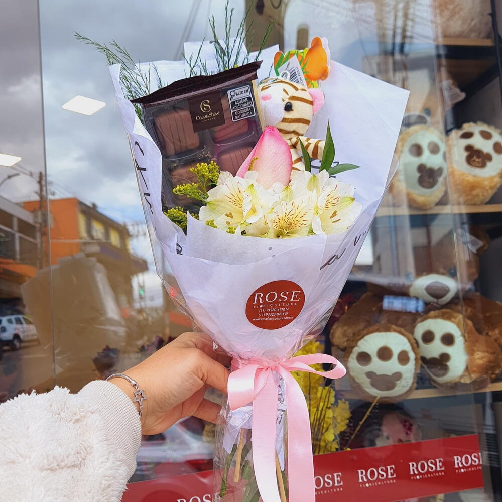 Presenteie alguém especial com este maravilhoso conjunto que combina natureza e guloseimas. Nossa Astroméria Branca é a estrela do show, complementada magistralmente com uma Rosa Botão na cor rosa suave. Junto com este romântico dueto floral, está os deliciosos Chocolate Brownie de 78g, pronto para adoçar o dia de alguém. O conjunto é finalizado com um singelo chaveirinho e tudo devidamente embalado com um laço, fazendo deste presente um mimo perfeito e encantador.