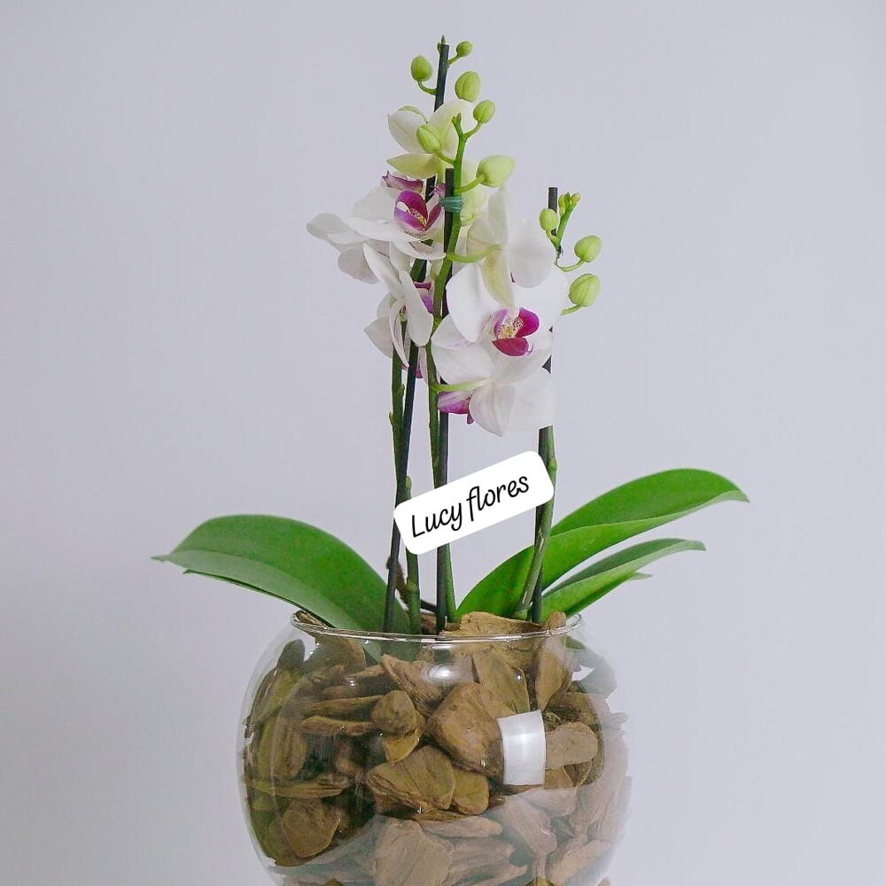 Orquídea branca com centro roxo em vaso de vidro redondo. Um arranjo elegante com substrato natural, ideal para presentear ou decorar com charme e leveza.