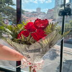 rosa vermelha - 3 un. embalagem - 1 un. folhagens - 1 un. laço - 1 un. mini balão personalizado - 1 un.