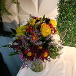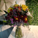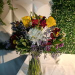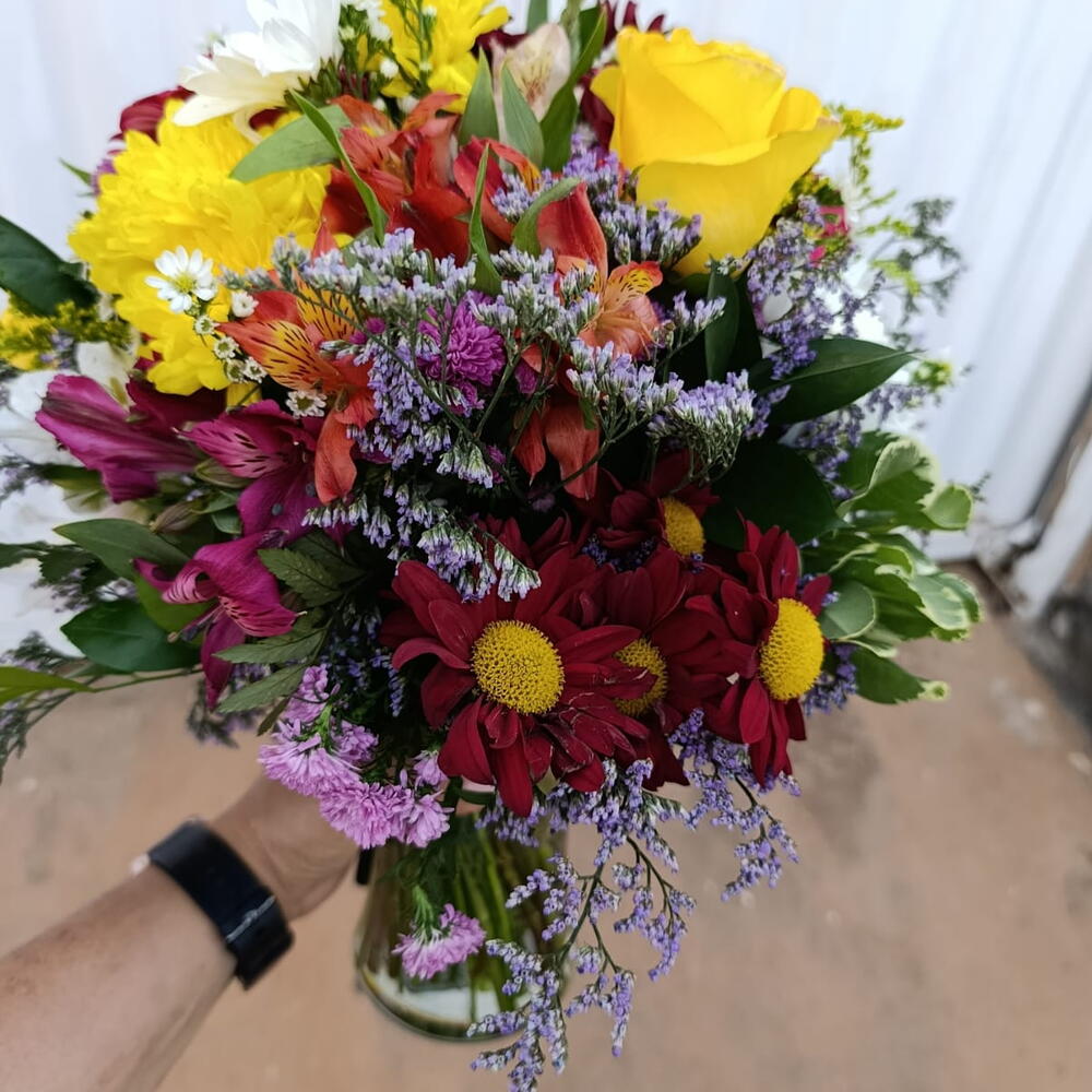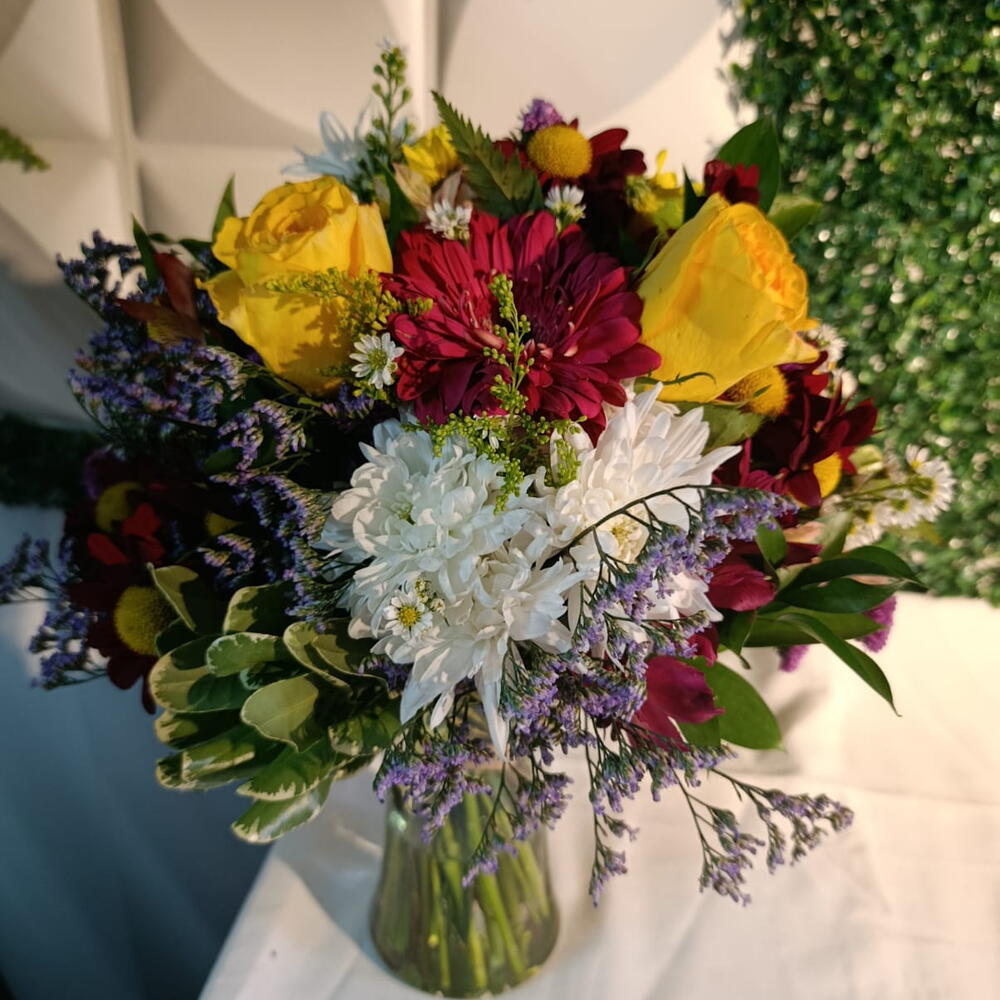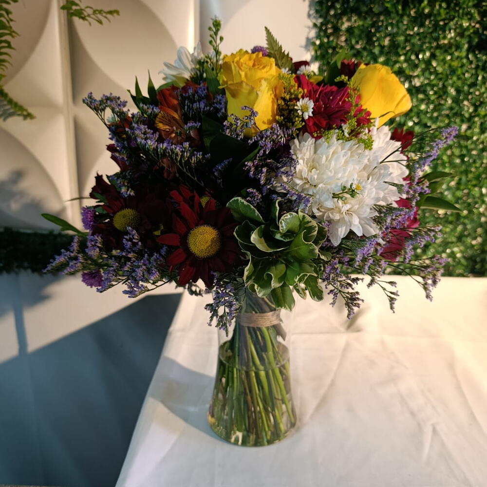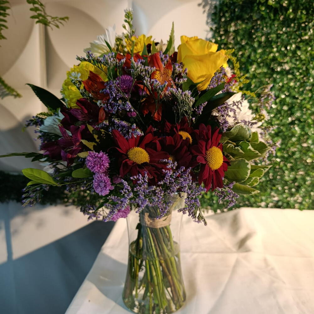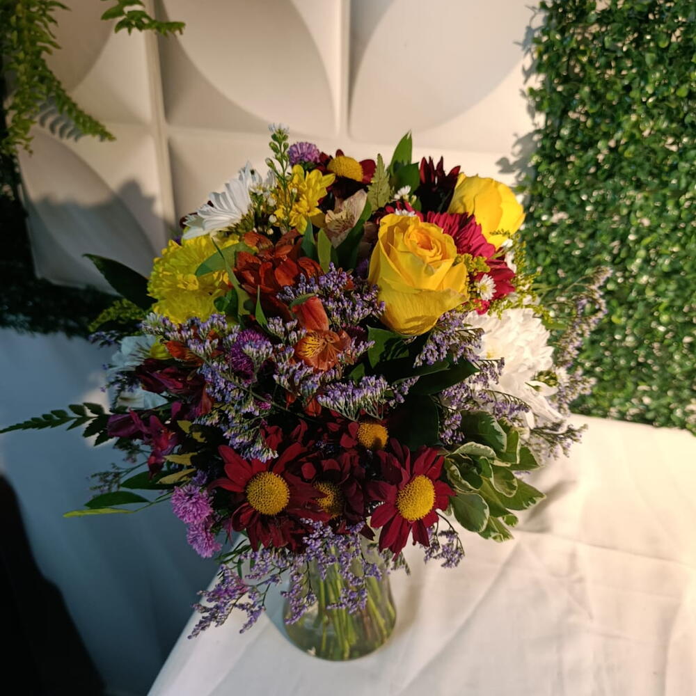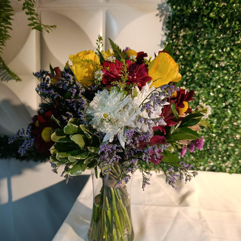 Este lindo arranjo de flores é composto por três unidades de folhagem verde vibrante, arranjadas artisticamente em um vaso de vidro elegante. Cheio com oito flores coloridas variadas, este arranjo é um carnaval de cor, criando uma atmosfera alegre onde quer que esteja. Complementado por dois acessórios variados de aster e tango, esse é um arranjo de flores que combina charme rústico e elegância moderna, uma escolha perfeita para alegrar qualquer ambiente!